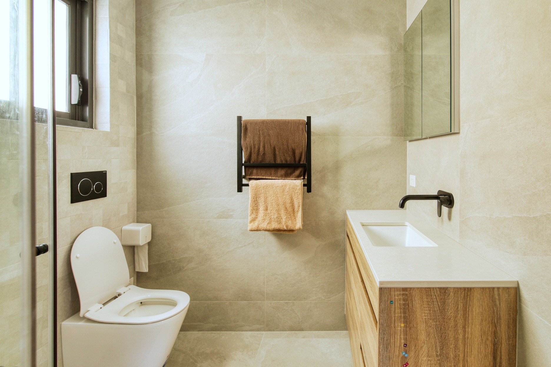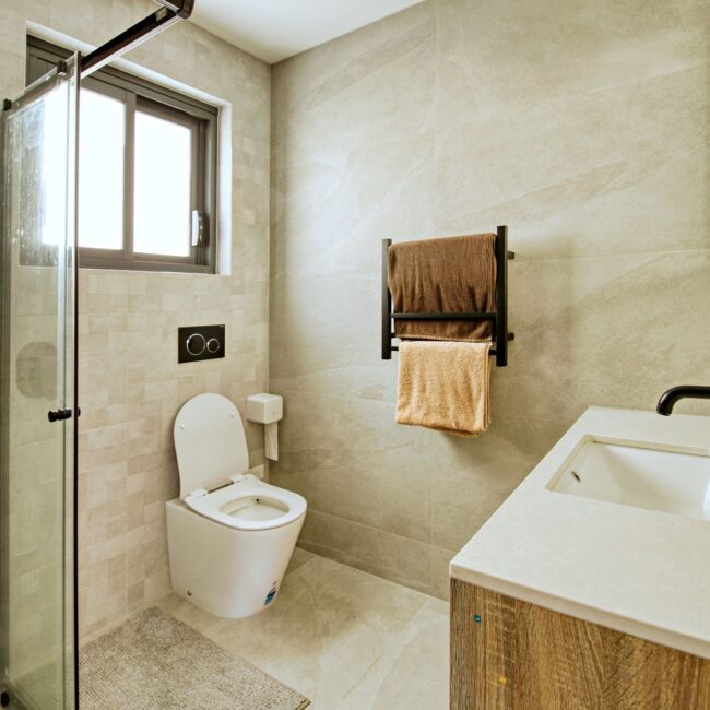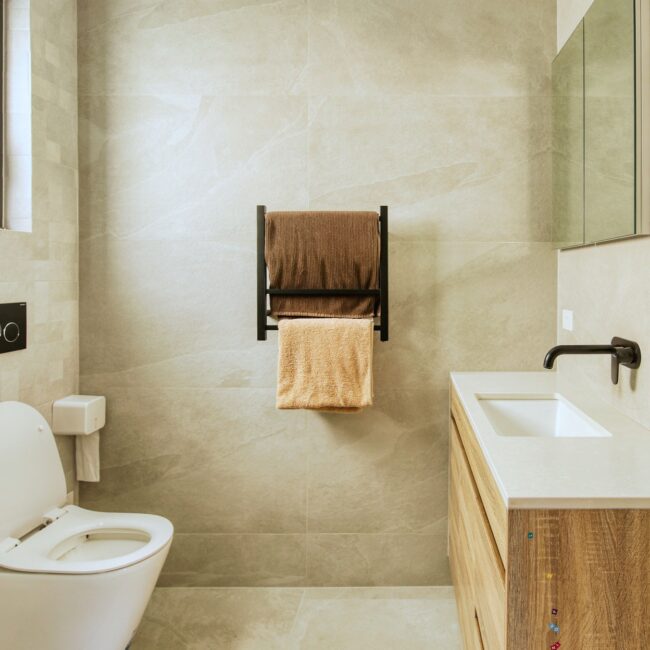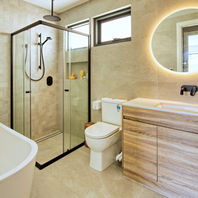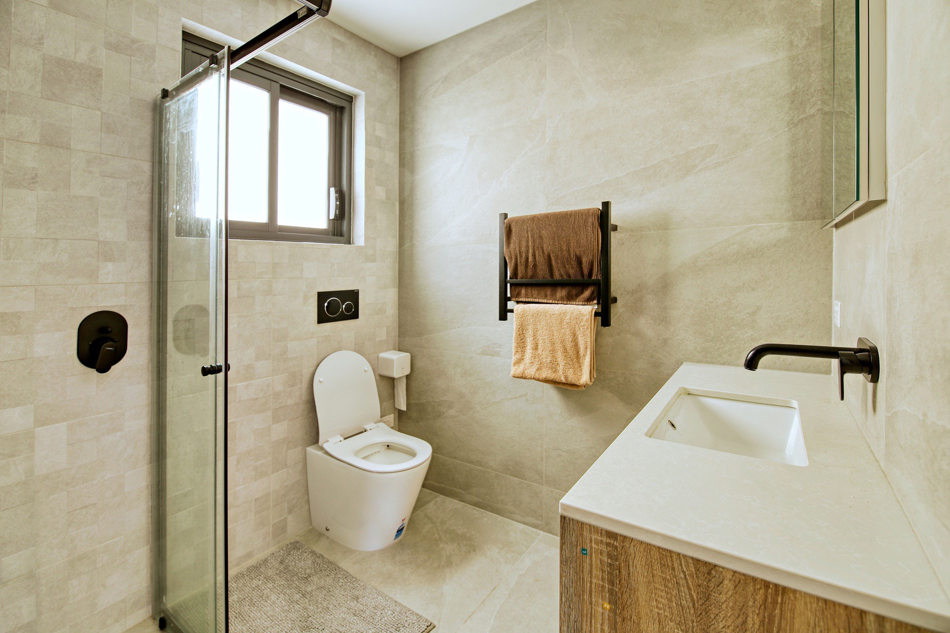 Revel in the refined elegance of the recently renovated bathrooms at Mount Waverley, where a harmonious blend of earthy tones and modern design elements creates a timeless sanctuary. Both bathrooms carry beige sand tone tiles which grace the floor and walls, enveloping the space in a warm and soothing ambiance. The choice of these tiles establishes a tranquil backdrop, creating a sense of serenity and inviting comfort into the room. The neutral palette sets the stage for the other design elements to shine while fostering a timeless and sophisticated aesthetic. Wood cabinets add a touch of natural warmth to the bathroom, infusing the space with a comforting and organic feel. The wooden texture complements the beige sand tones, creating a cohesive and inviting atmosphere. The cabinets not only provide functional storage but also contribute to the overall aesthetic, bringing a touch of nature into the heart of the bathroom.