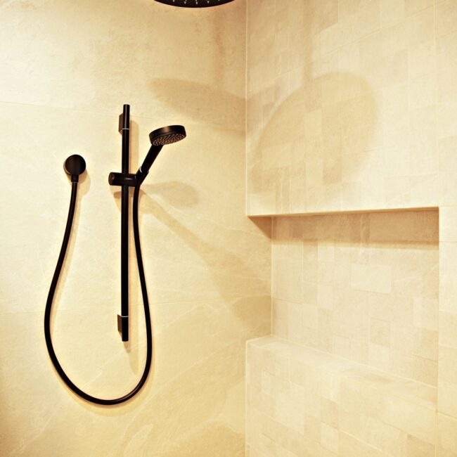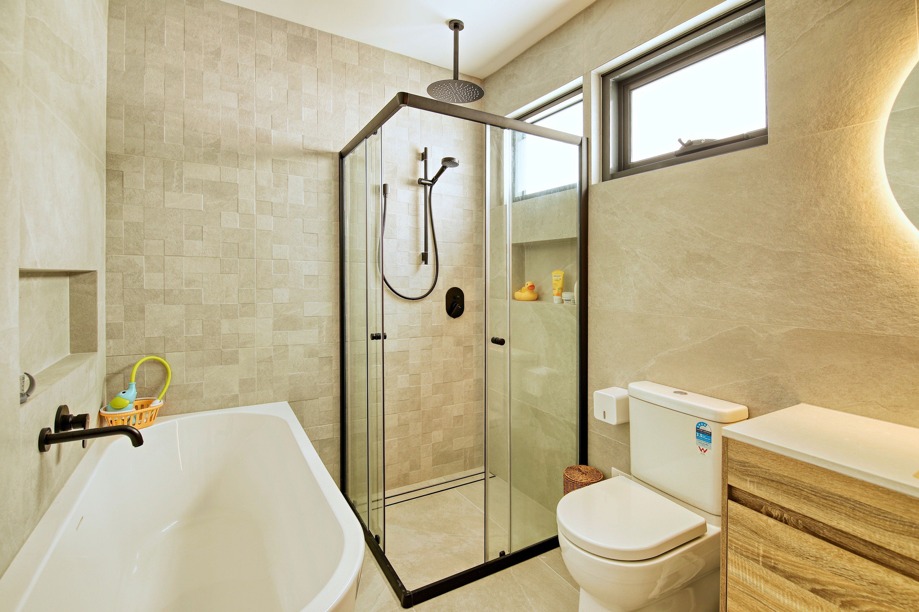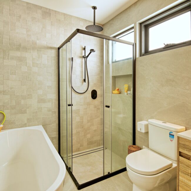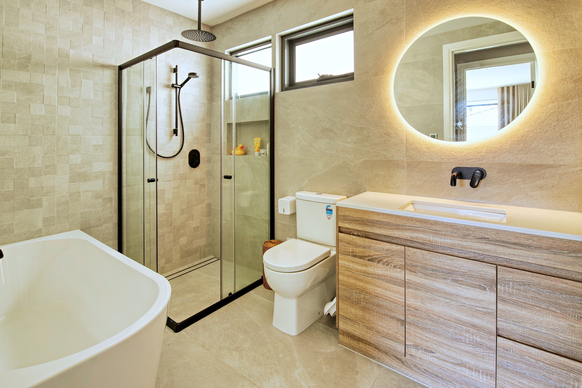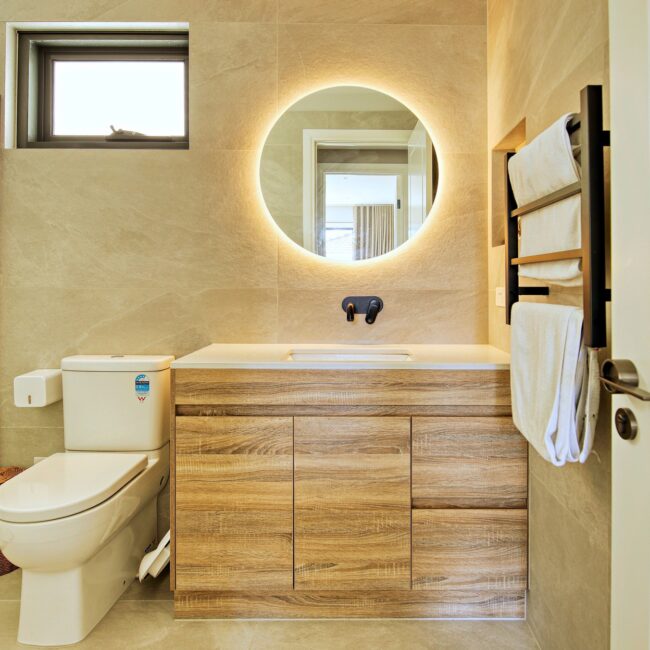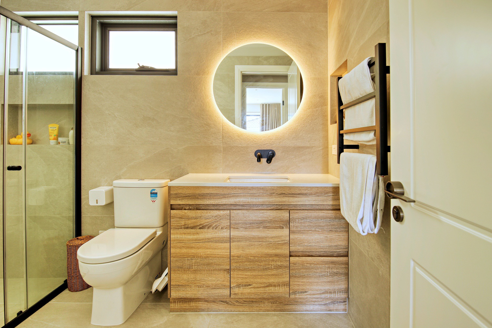 Revel in the refined elegance of the recently renovated bathrooms at Mount Waverley, where a harmonious blend of earthy tones and modern design elements creates a timeless sanctuary. Both bathrooms carry beige sand tone tiles which grace the floor and walls, enveloping the space in a warm and soothing ambiance. The choice of these tiles establishes a tranquil backdrop, creating a sense of serenity and inviting comfort into the room. The neutral palette sets the stage for the other design elements to shine while fostering a timeless and sophisticated aesthetic. Wood cabinets add a touch of natural warmth to the bathroom, infusing the space with a comforting and organic feel. The wooden texture complements the beige sand tones, creating a cohesive and inviting atmosphere. The cabinets not only provide functional storage but also contribute to the overall aesthetic, bringing a touch of nature into the heart of the bathroom.