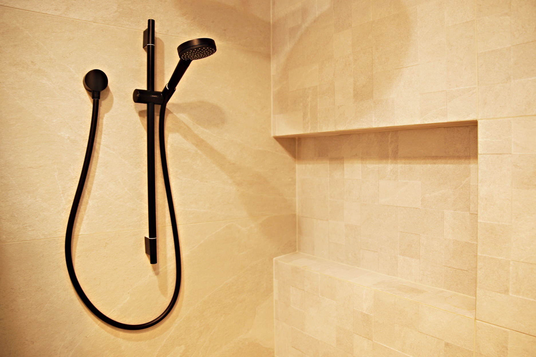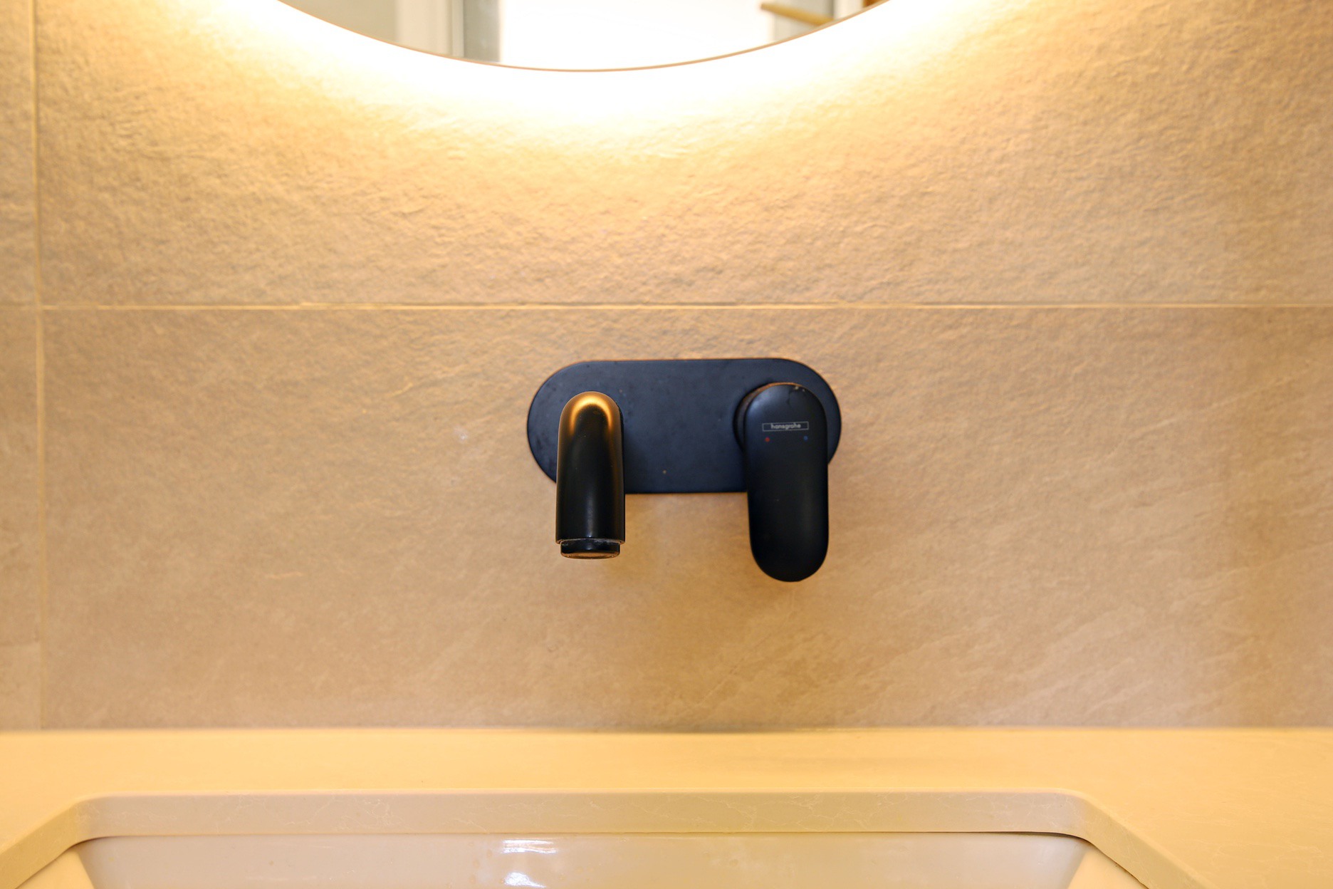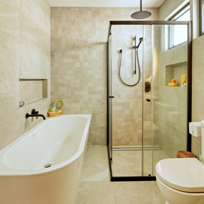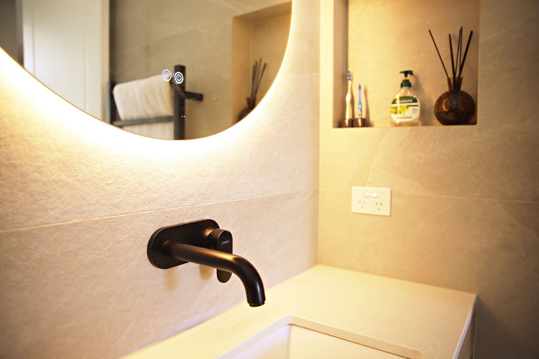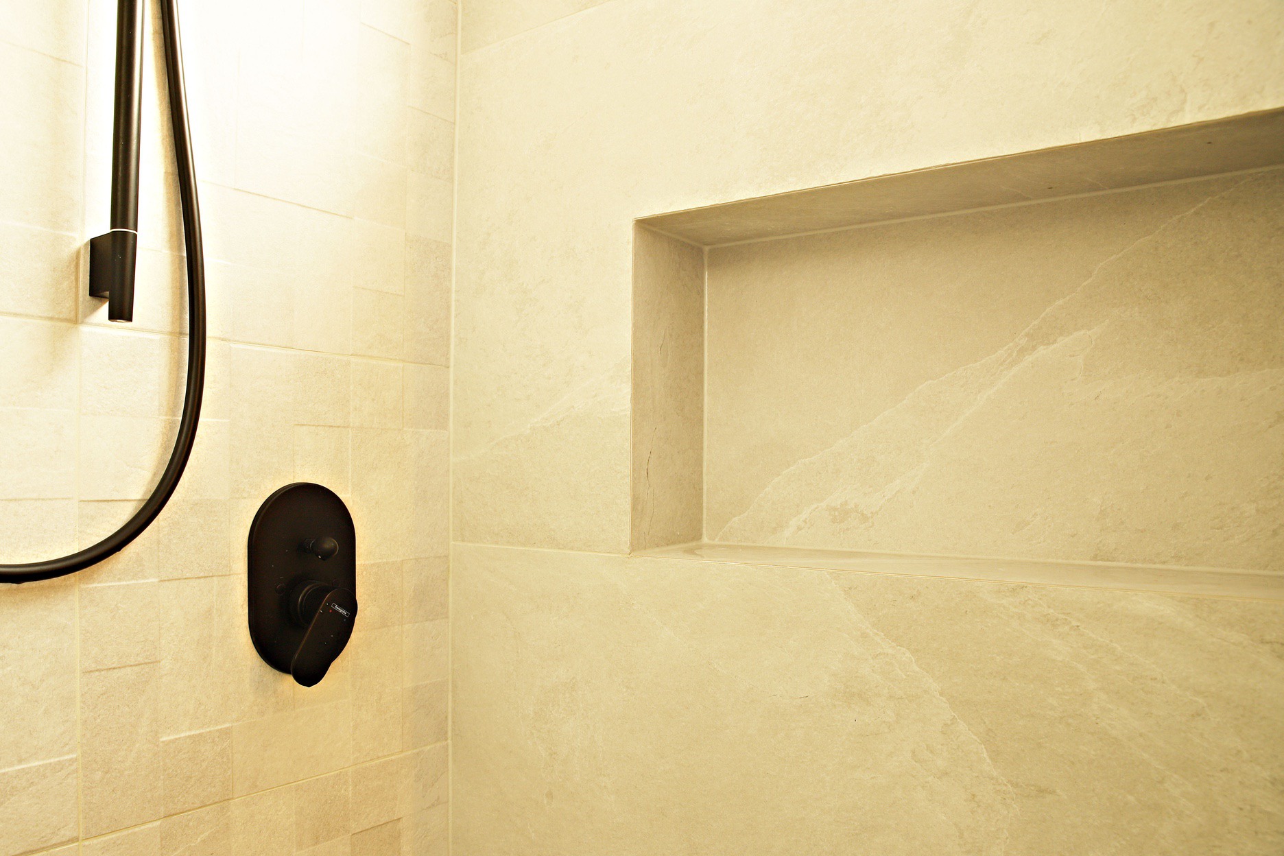 In a striking contrast that adds a contemporary edge, black taps and mixer fixtures punctuate the space. The sleek matte black finish stands out against the neutral backdrop, creating a visual focal point that adds a touch of modern sophistication.The combination of beige sand tones, wood cabinets, and black fixtures results in a balanced interplay of textures and hues, elevating the overall design of the bathroom. Together, the beige sand-tone tiles, wood cabinets, and black taps and mixer create a bathroom that is both timeless and contemporary at 46 William Street. It's a space where the synergy of natural elements and modern design creates a haven ofcomfort and style. This renovation invites you to indulge in a bathroom experience that seamlessly merges warmth, sophistication, and a touch of boldness.