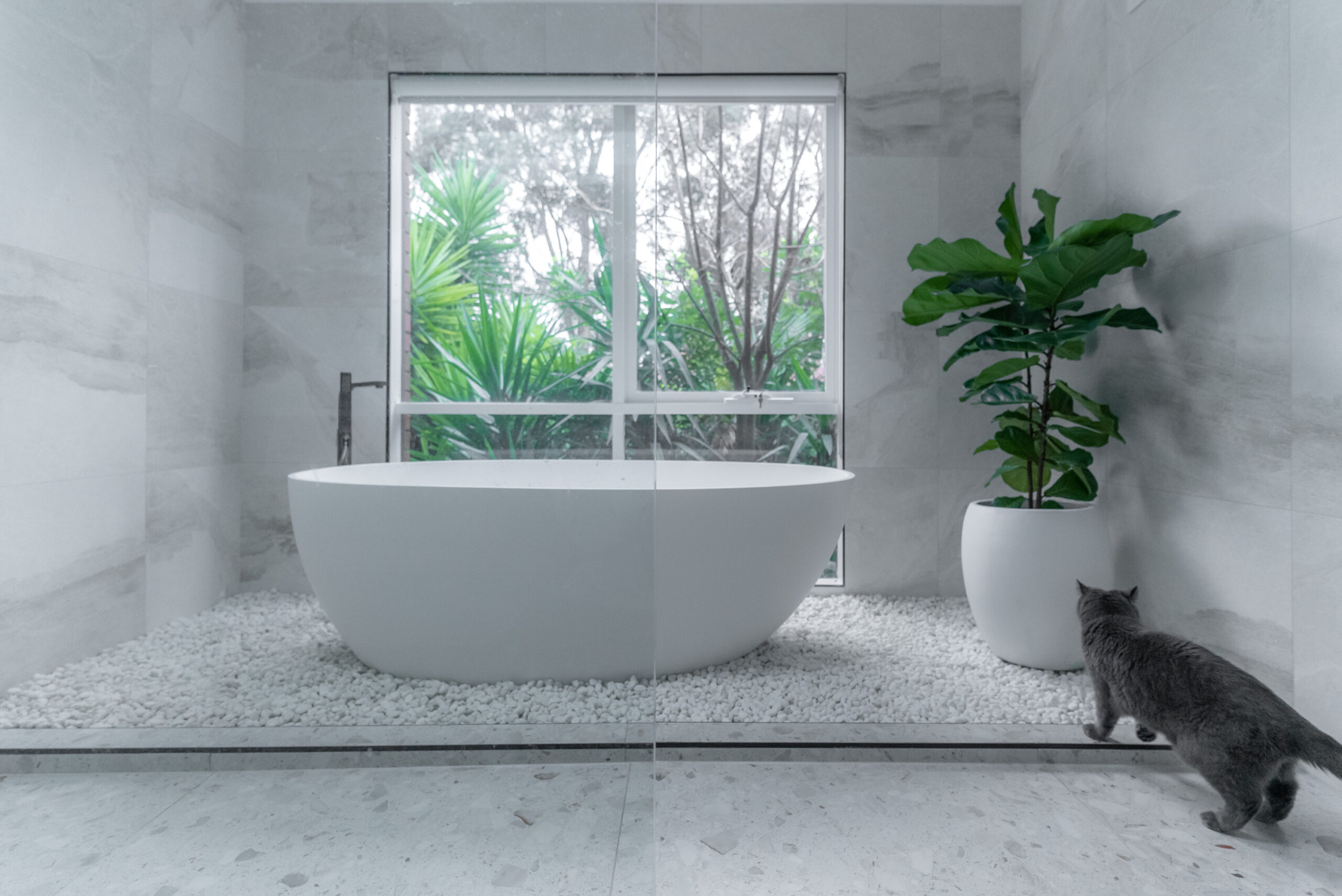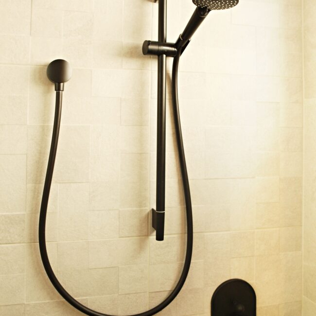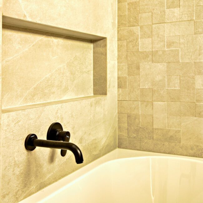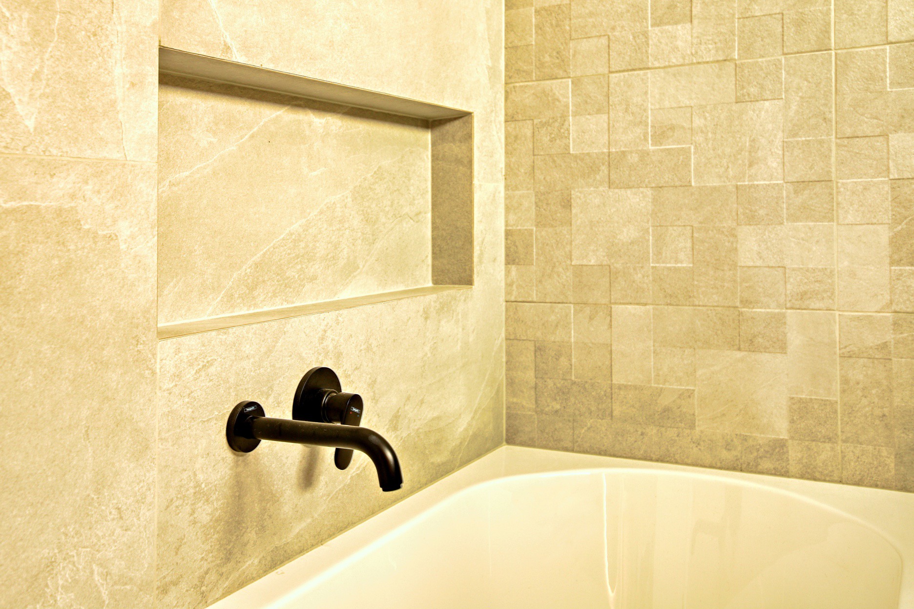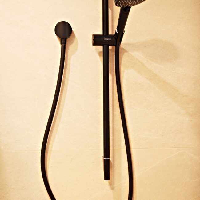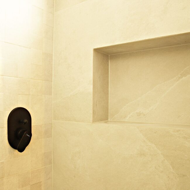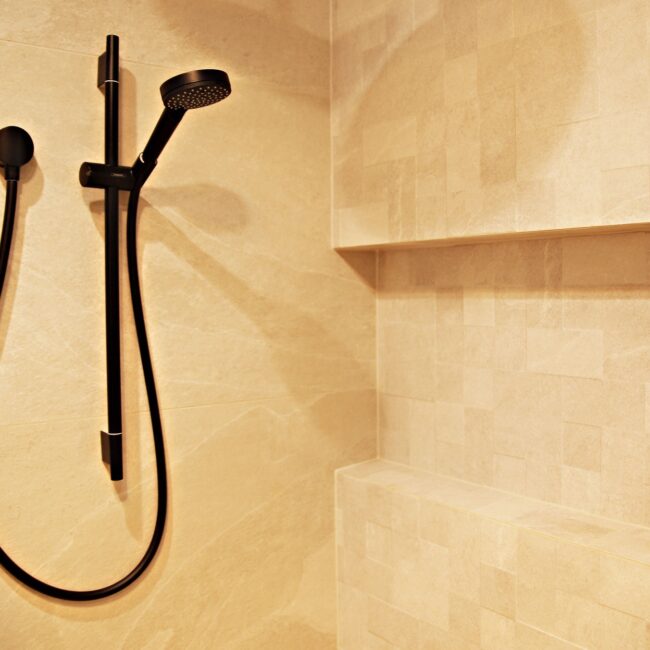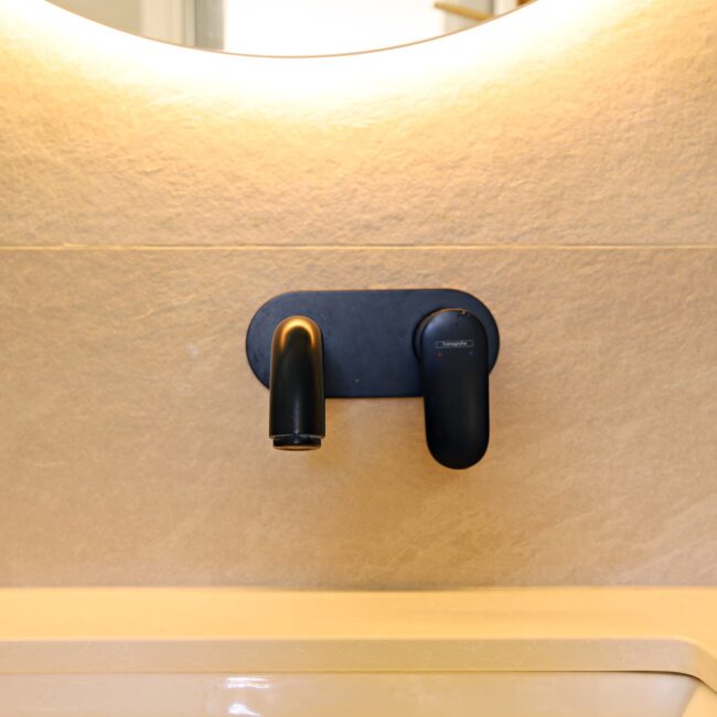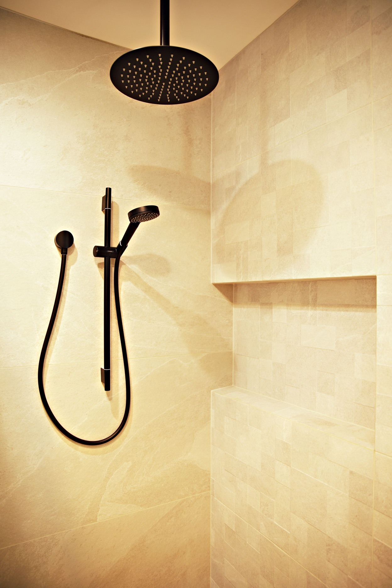 In a striking contrast that adds a contemporary edge, black taps and mixer fixtures punctuate the space. The sleek matte black finish stands out against the neutral backdrop, creating a visual focal point that adds a touch of modern sophistication.The combination of beige sand tones, wood cabinets, and black fixtures results in a balanced interplay of textures and hues, elevating the overall design of the bathroom. Together, the beige sand-tone tiles, wood cabinets, and black taps and mixer create a bathroom that is both timeless and contemporary at 46 William Street. It's a space where the synergy of natural elements and modern design creates a haven ofcomfort and style. This renovation invites you to indulge in a bathroom experience that seamlessly merges warmth, sophistication, and a touch of boldness.